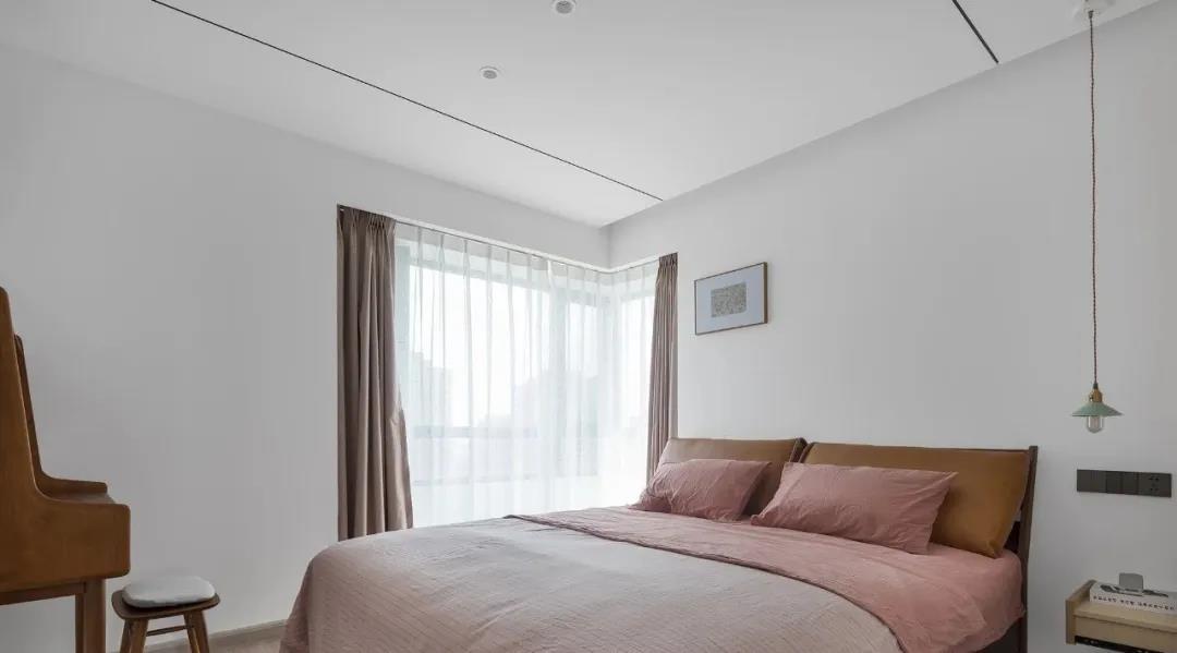 主臥,留白墻頂面配合點光源設計,溫馨簡約的軟裝布置,潔凈利落、安靜脫俗。